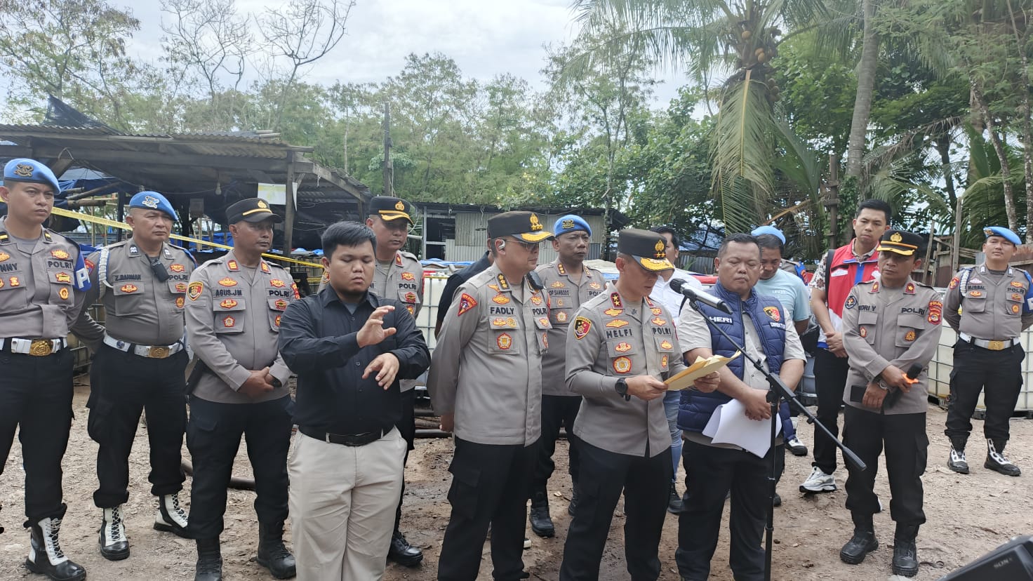 Kapolda Lampung Irjen Pol Helfi Assegaf merilis pengungkapan gudang BBM ilegal dalam konferensi pers di lokasi, Kamis 9 April 2026. Pengungkapan ini merupakan hasil penyelidikan selama seminggu.